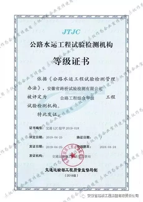 4月25日,经国家交通运输部工程质量监督局审查核发,公司全资子公司安徽省路桥试验检测有限公司正式获批公路工程综合甲级资质,成为新资质标准出台后安徽省首家获批公路综合甲级检测资质的企业,安徽省第四家拥有公路综合甲级检测资质的企业,并顺利开展首个市场化交竣工验收项目。今年,公司又新增建筑施工总承包三级资质,企业资质进一步丰富。