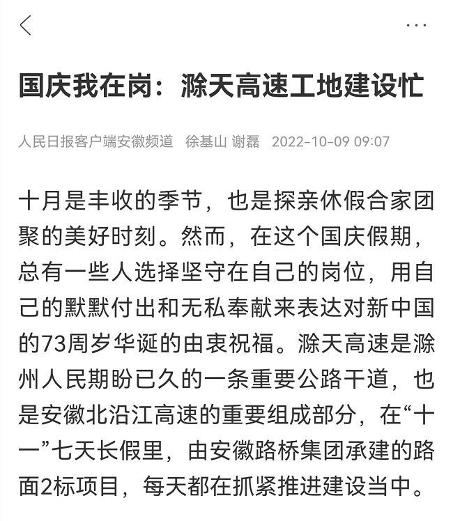 10月9日,人民日报客户端以《国庆我在岗:滁天高速工地建设忙》为题,报道路桥集团滁天高速项目在国庆长假期间,每日抓紧推进施工生产,用辛勤劳动和实干业绩迎接党的二十大胜利召开。