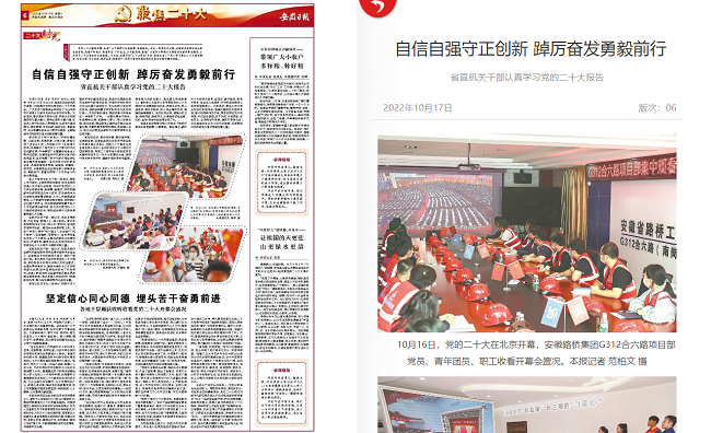 2022年10月17日,《安徽日报》“聚焦二十大”专版,以《自信自强守正创新 踔厉奋发勇毅前行——省直机关干部认真学习党的二十大报告》为题,图片新闻形式报道G312合六路项目部党员、青年团员、职工收看开幕会盛况。