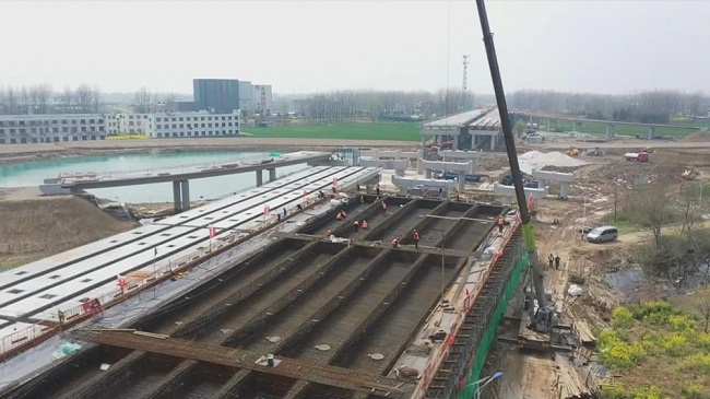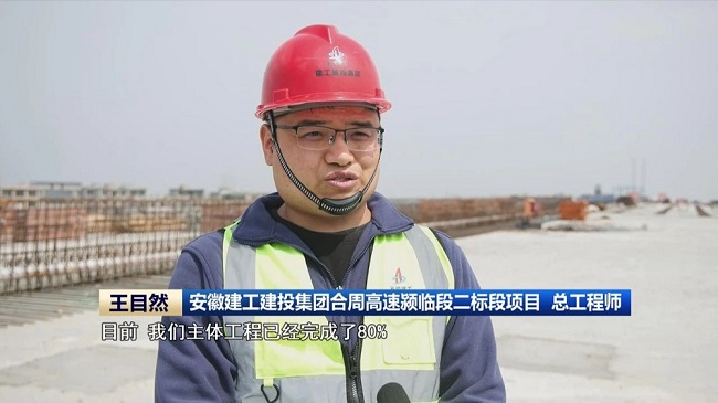 今年以来,安徽有效增加交通建设投资,加速推进44个,2145公里的高速公路建设,为全面建设现代化美好安徽提供更加坚实有力的交通运输服务保障。 在合肥至周口高速公路颍临段施工现场,200多名工人正抢抓晴好天气进行现浇梁进行钢筋绑扎作业,目前,项目路基、桥梁工程已全部完成。 安徽建工建投集团合周高速颍临段二标段项目总工程师 王目然:目前,我们主体工程已经完成了80%,我们标段内包括阜南东互通、陶孜河特大桥以及阜南东服务区等三个控制性工程也已完成了80%。 合肥至周口高速公路颍上至临泉段是安徽省规划的“五纵十横”高速公路网的重要组成部分,设计时速120km,设计标准为双向四车道一级公路。 阜阳市阜南县交通运输局党组书记、局长 张涛:建成通车后,不仅方便沿线群众的生活,为当地群众提供更加安全便捷的出行方式,同时也促进沿线地区经济和贸易的发展。