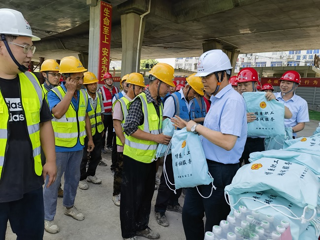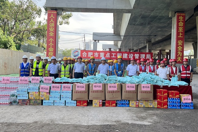 张刚一行详细了解施工进展情况及项目部防暑降温举措,看望并慰问高温下仍坚守岗位的一线工人,同工人们进行亲切交流,送上了人丹、十滴水、洗漱用品及矿泉水等防暑降温物资,感谢他们为合肥大建设作出的贡献,并叮嘱工人们要注意自我防护和安全生产,做好防暑降温,做到劳逸结合,适当休息,以健康、饱满的状态投入到生产中。