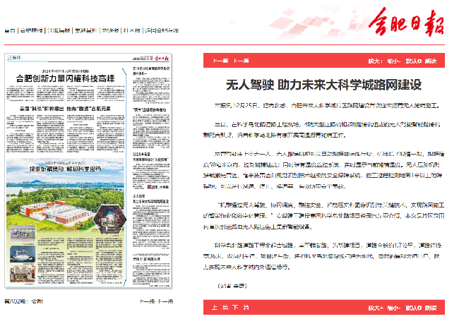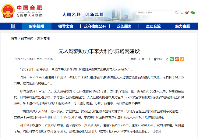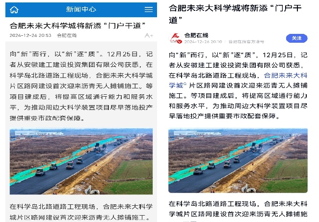 12月25日,建工建投集团合肥市科学岛北路等4条道路工程项目沥青下面层无人摊压施工顺利进行。《合肥日报》、合肥在线等媒体深入项目一线展开报道,稿件登上合肥市政府官网首页。