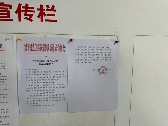 为进一步加强廉洁文化教育,分公司团支部发布“青春沐清风 携手向未来”廉洁从业倡议书,鼓励各项目立足自身,打造多形式、多渠道的廉洁文化宣传阵地。同时划区分片定人送廉洁文化、警示案例到项目部,以案促廉,促使分公司团青受警醒、知敬畏、懂规矩、守纪律、明底线、慎言行、作表率。
