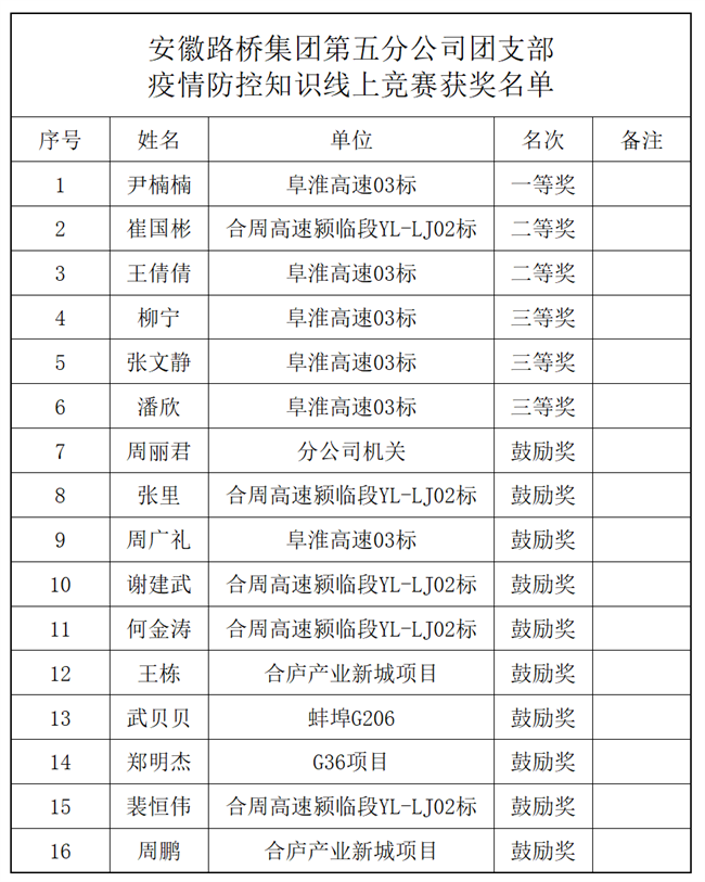 五分公司团支部还举办了线上防疫知识竞赛,围绕个人防护知识、防控政策、项目现场管理、健康排查、应急处置、宣传教育、日常监管等多个方面进行,以赛促学、以赛促行,最终16名团青取得优异成绩。在提升项目人员防疫知识水平,降低疫情风险的同时,进一步抓实抓细各项疫情防控措施,发挥“青”字号品牌优势。