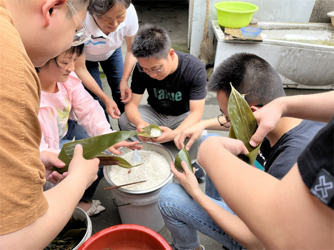 大家互相分享着包粽子的经验,将满载美好寓意的莲子、蜜枣、红豆、绿豆、花生、用清香箬叶包裹,欢声笑语中,一片片粽叶、一粒粒糯米,在灵巧的手中变成了香甜可口的粽子。