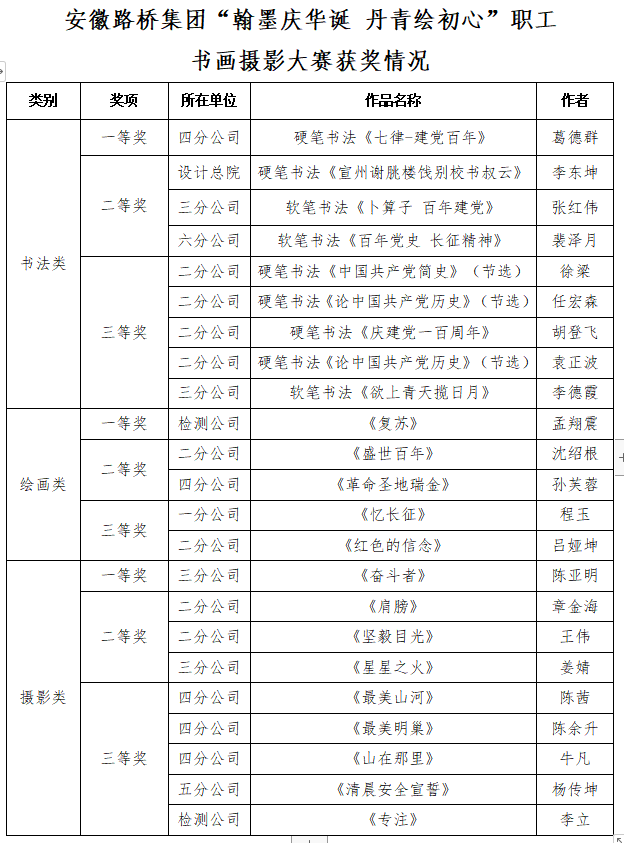 为庆祝中国共产党成立100周年,安徽路桥集团工会举办“翰墨庆华诞 丹青绘初心”职工书画摄影大赛,本次活动得到了公司领导高度重视和公司员工的积极响应,共收集各类作品64幅,其中书法作品25幅,绘画作品11幅,摄影作品28幅。这些作品是路桥集团职工将笔墨和镜头对准施工生产一线,记录下路桥人火热的生活和劳动创造的精彩瞬间,充分展示了路桥集团广大干部职工深厚的文化底蕴、饱满的创作热情和扎实的艺术功底。参赛作品风格迥异、主题突出、创意鲜明、各具特色,或意境深远、气势不凡,或气韵生动、端庄隽永,或粗犷雄逸、尽显风神骨气,从不同角度洋溢出作者爱祖国、爱生活的情怀,同时也展现了路桥集团人昂扬向上的时代风采。