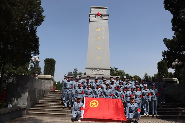 在统一换上红军服装后,青年团员们首先来到金寨红军文化广场。在革命烈士纪念塔下,面对鲜艳的中国共产主义青年团团旗,公司团委书记带领到场青年团员重温入团誓词,牢记初心使命,缅怀革命先烈,传承五四精神,并对荣获公司2020年度“五四红旗团支部”与“优秀团员”的集体与个人进行了表彰。