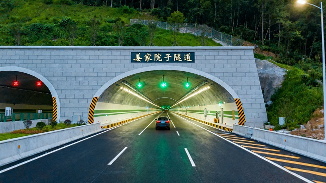 姜家院子隧道设计为双向行驶的双洞四车道高速公路隧道,其左线长达3370米,右线长达3415米,属工程难度较高的“特长隧道”类别,是垫丰武高速公路项目的“咽喉”工程之一。隧道内共设有4道车行横通道、9道人行横通道及1座洞内变电所,全面保障未来运营期间的通行安全与应急疏散需求。同时,隧道采用先进的电光照明系统、高效的机械通风方式以及可靠的自流排水方案,致力于为司乘人员提供安全、舒适、绿色的行车环境。